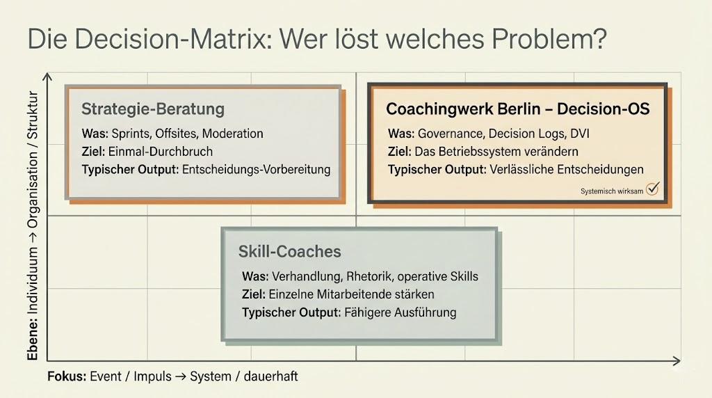 Wenn Sie weniger „wir nehmen das mal mit“ und mehr verlässliche Beschlüsse wollen, ist diese Seite die schnelle Orientierung: Was unterscheidet Coachingwerk von klassischer Beratung - und warum liefert ein Decision-OS oft mehr Wirkung als zusätzliche Projekte.